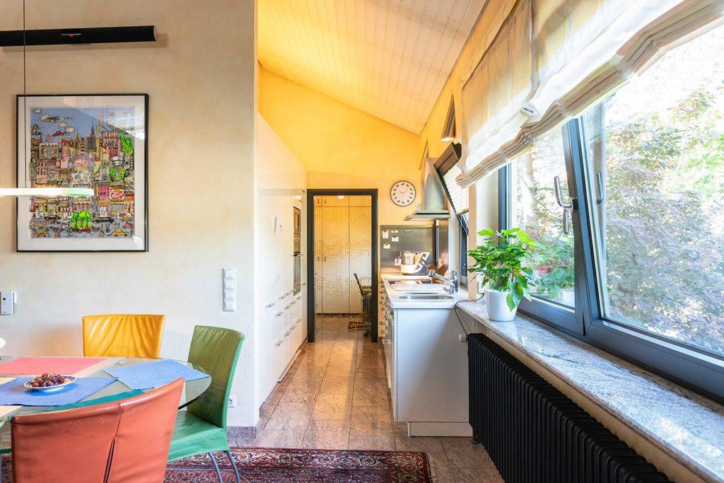 Die Küche ist offen zum Essplatz auf einer höheren Ebene (2 Stufen), abgetrennt und dennoch großzügig, sichtbar verbunden mit dem großen Wohnbereich mit offenem Kamin und Ausgang zum Wintergarten. Die Aufenthaltsqualität und Großzügigkeit überraschen bereits beim Eintritt in den Wohnbereich. Die großen Fenster zum Garten sowie die bodentiefe Verglasung zum Wintergarten geben das Gefühl direkt im schön angelegten Garten zu verweilen. Der Wintergarten dient als heller Raum zum Verweilen aber auch als guter Temperaturspeicher bzw. -ausgleich im Sommer wie auch im Winter.