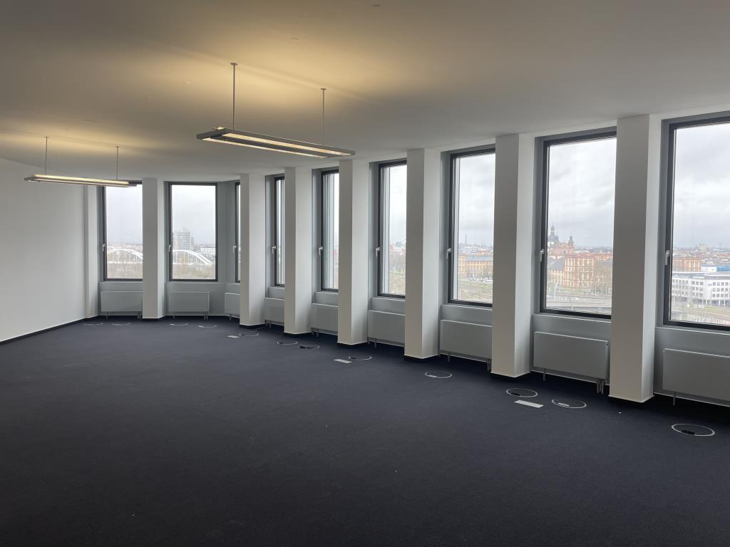 Die beeindruckende Architektur sorgt für einen Grundriss, der es ermöglicht jedes der 27 Obergeschosse in zwei Einheiten von 375 qm Mietfläche zu unterteilen. Die Mietflächeneffizienz wird durch den teilweisen Entfall bisher notwendiger Flure noch gesteigert und bietet so ideale Voraussetzung für New Work – mit lichtdurchfluteten und anpassungsfähigen Flächen, Einzel-, Kombi-, Teambüros, die sich individuellen Bedürfnissen anpassen lassen.